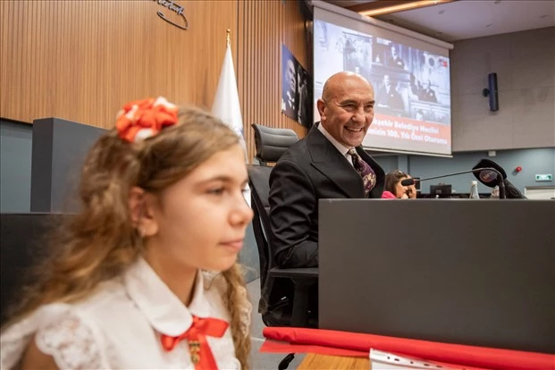 İzmir Büyükşehir Belediyesi Meclisi, Türkiye’nin 100’üncü yaşı onuruna Gençlik Belediyesi ve Çocuk Belediyesi üyelerinin katılımıyla özel gündemle toplandı. Meclis salonu koltuklarının tamamının dolduğu bu tarihi oturumda ilçe belediye başkanları, sivil toplum örgütlerinin temsilcileri, muhtarlar, çocuklar ve gençler hep bir ağızdan “Yaşasın Cumhuriyet” diye haykırdı. Her kesimden temsilcinin söz aldığı meclis, 100 yıl öncesini yad etti. Cumhuriyet’e sahip çıkma sözü verdi.
